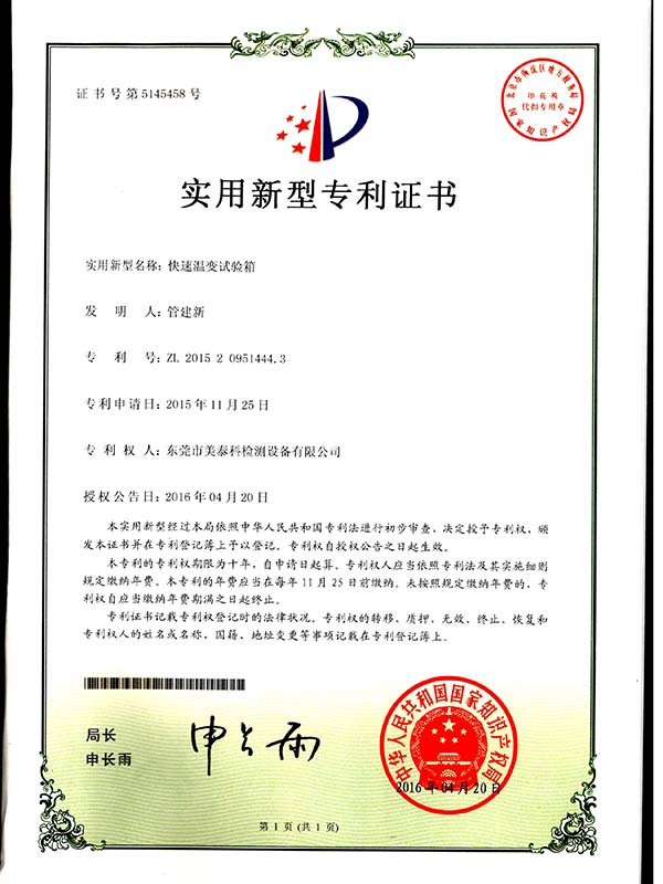 快速温变试验箱专利证书