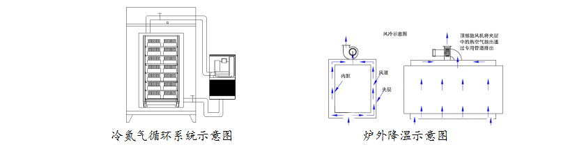 选配:冷氮气循环系统。原理:加热完毕后,充入一次氮气,冷却风道开启,氮气通过风机进入密封水冷系统(冷水盘管)冷却,再通过冷却风道回到箱体,实现冷氮循环。(冷氮循环系统配置在设备外部或设备顶部,为单独孤立系统)